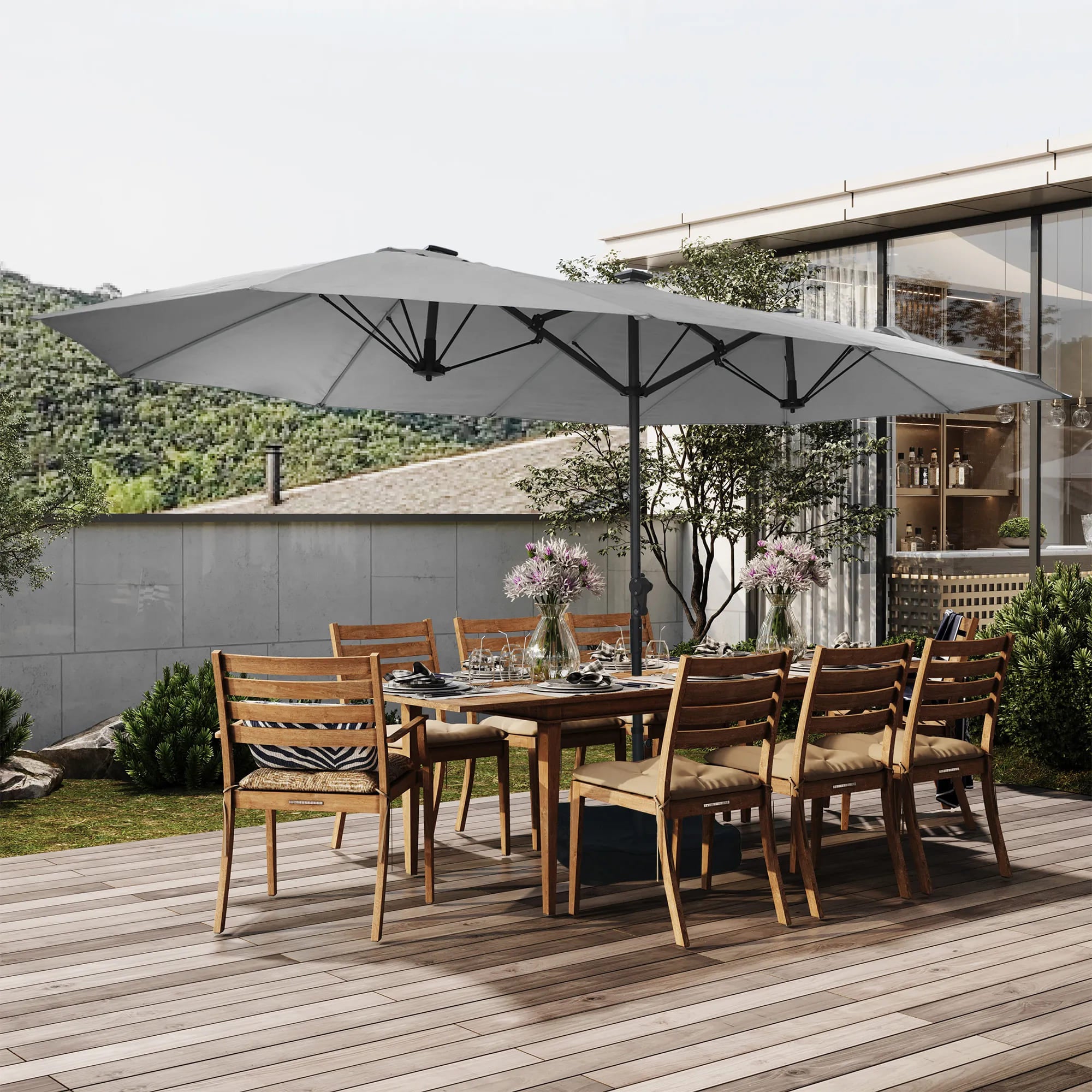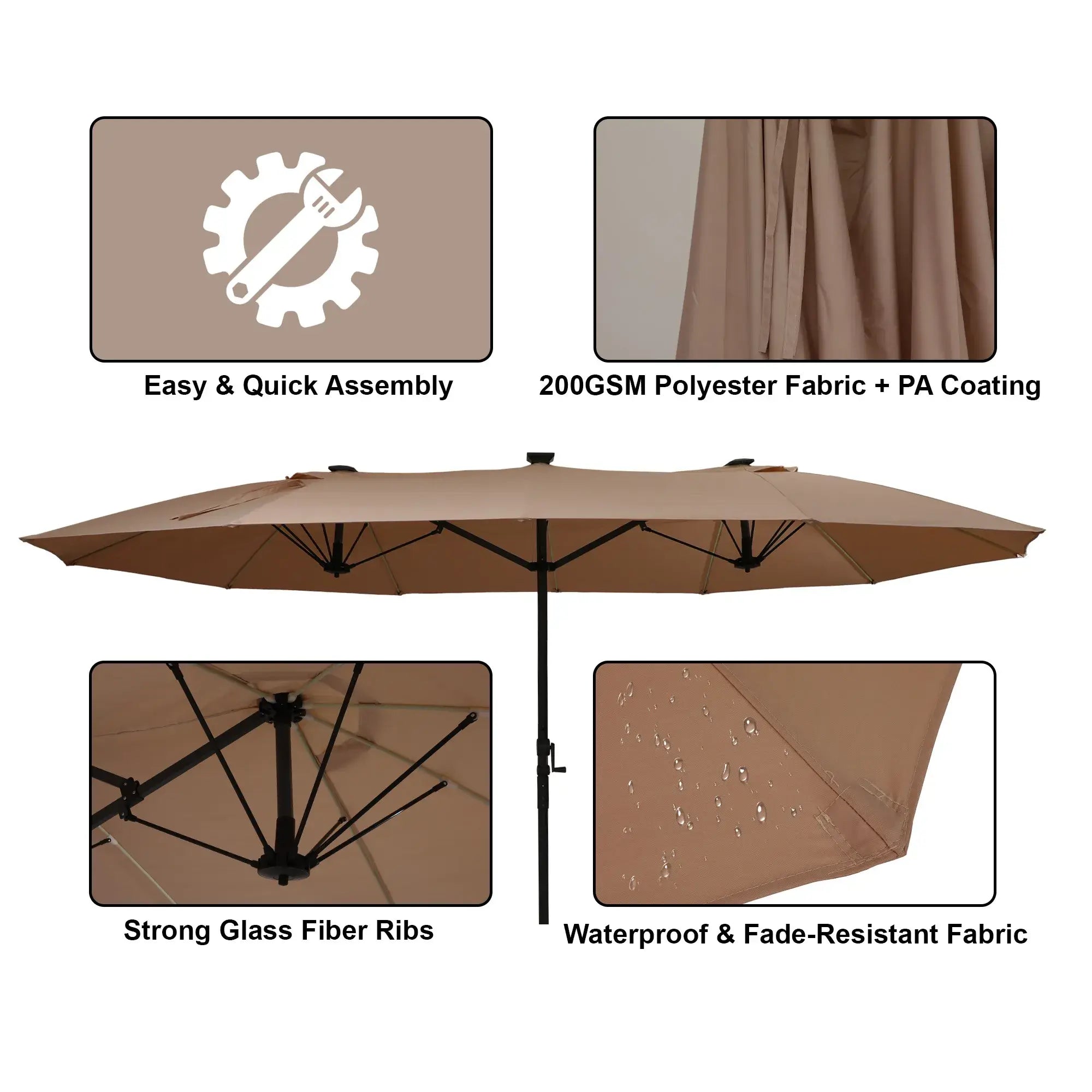 Discover the epitome of outdoor comfort and sophistication with our innovatively designed dual-sided patio umbrella. Experience unparalleled convenience and ambiance as we redefine your outdoor shade experience with a host of remarkable features.