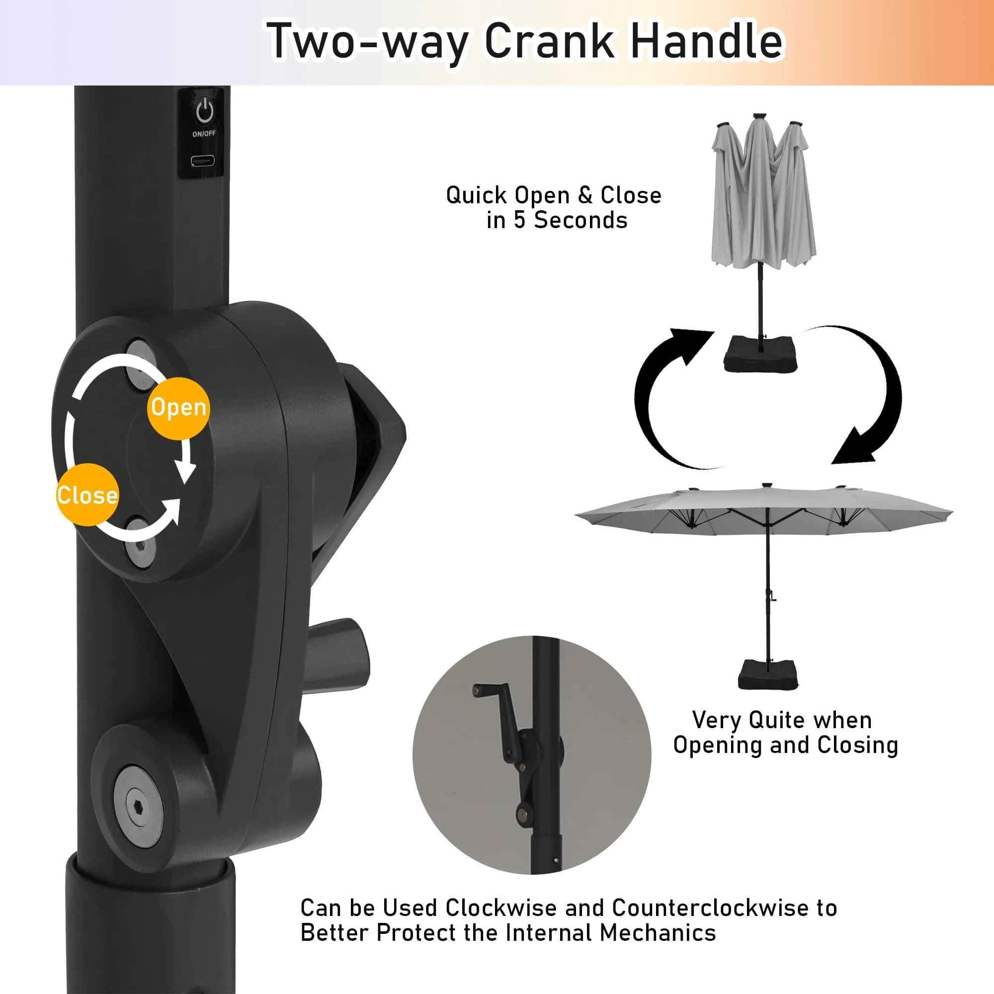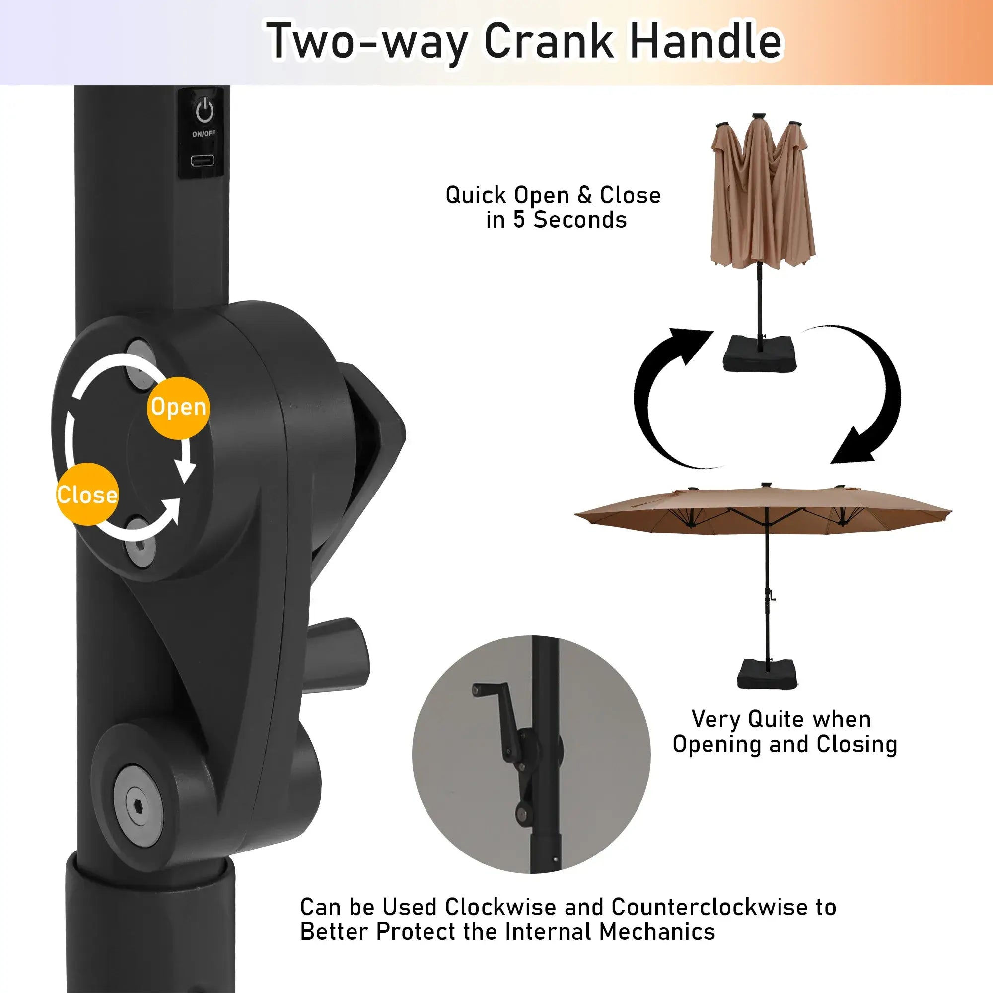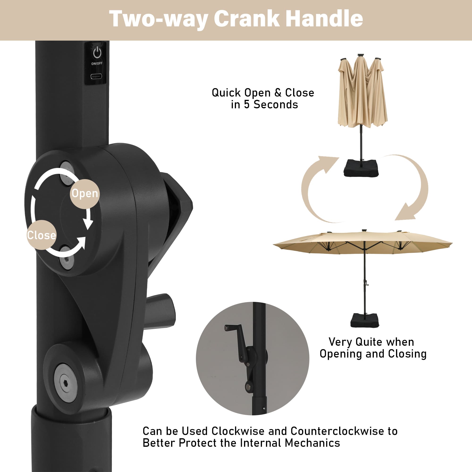 • Patented Hand-Crank Design: Effortlessly open and close your umbrella with our patented hand-crank mechanism. Experience quick deployment and quiet operation, all enhanced by a two-way crank handle for added convenience.