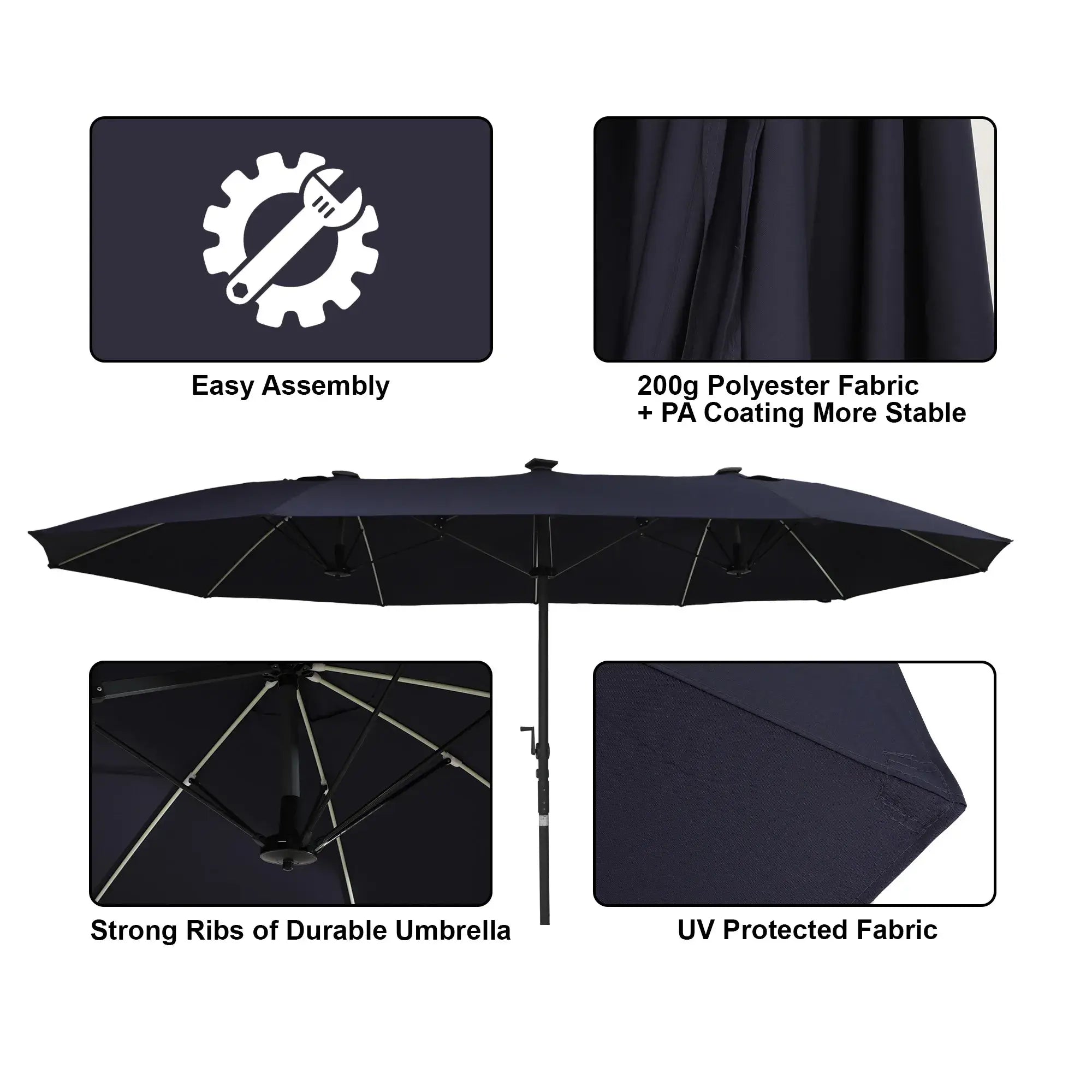 • High-Quality Fiberglass Ribs: Embrace resilience with our high-quality fiberglass umbrella ribs, renowned for their unyielding toughness and resistance to breakage. Enjoy long-lasting shade and relaxation.