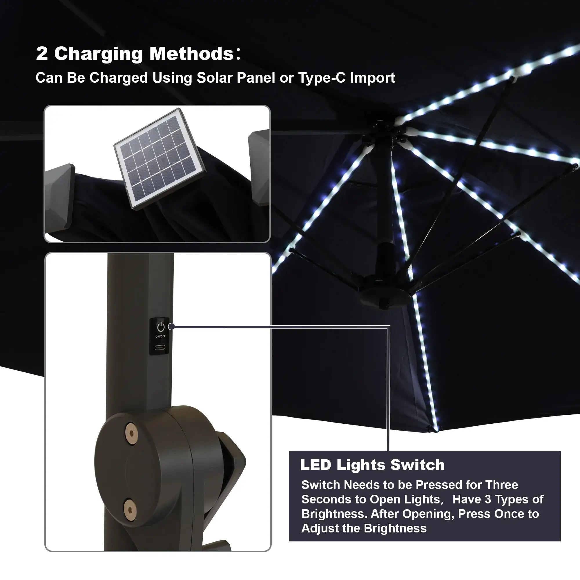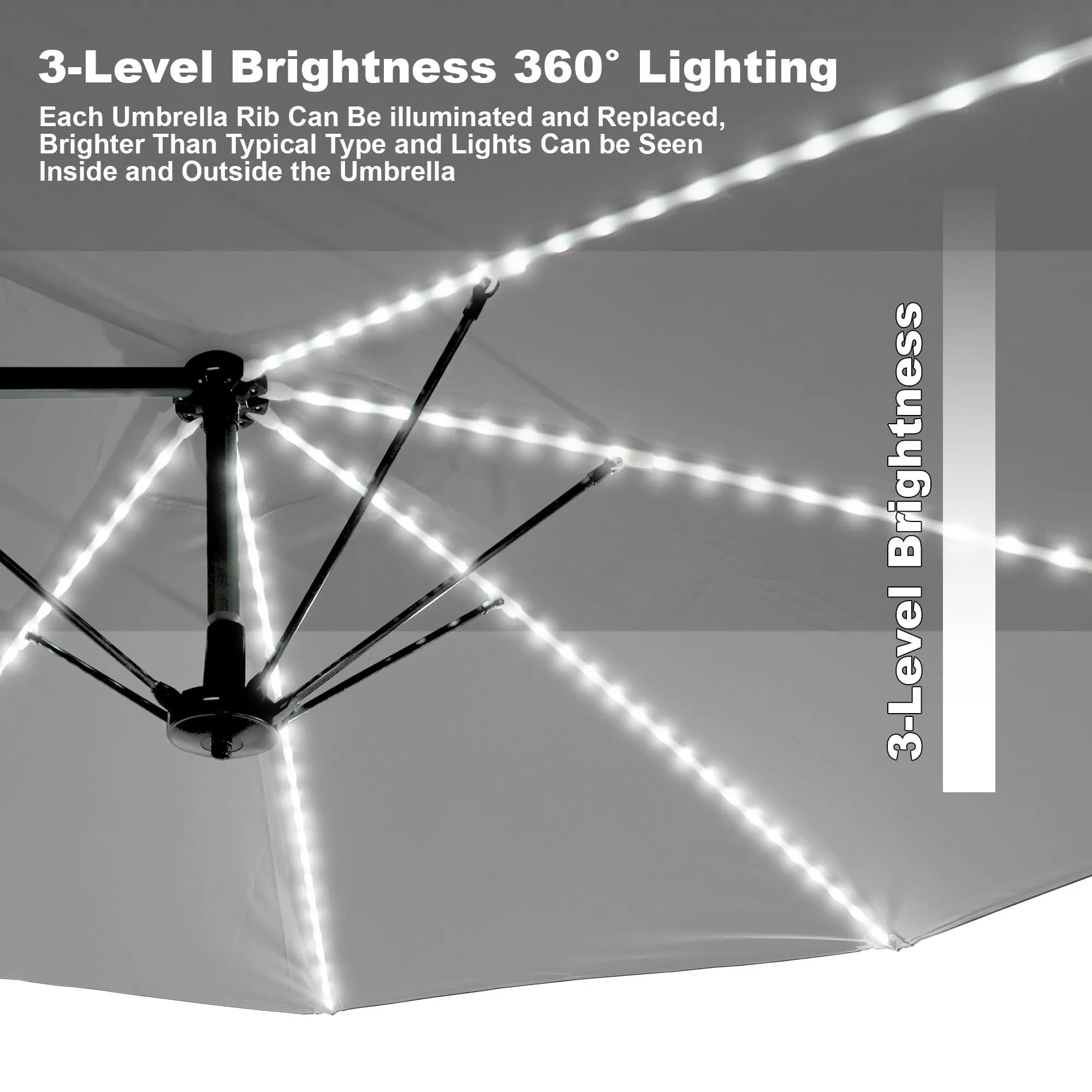 • 360° Luminous Feature: Immerse yourself in the gentle glow of our umbrella's unique 360-degree luminous feature. Within the fiberglass ribs lies an integrated luminescent system, offering three levels of brightness. Simply press the switch for three seconds to activate the captivating light.