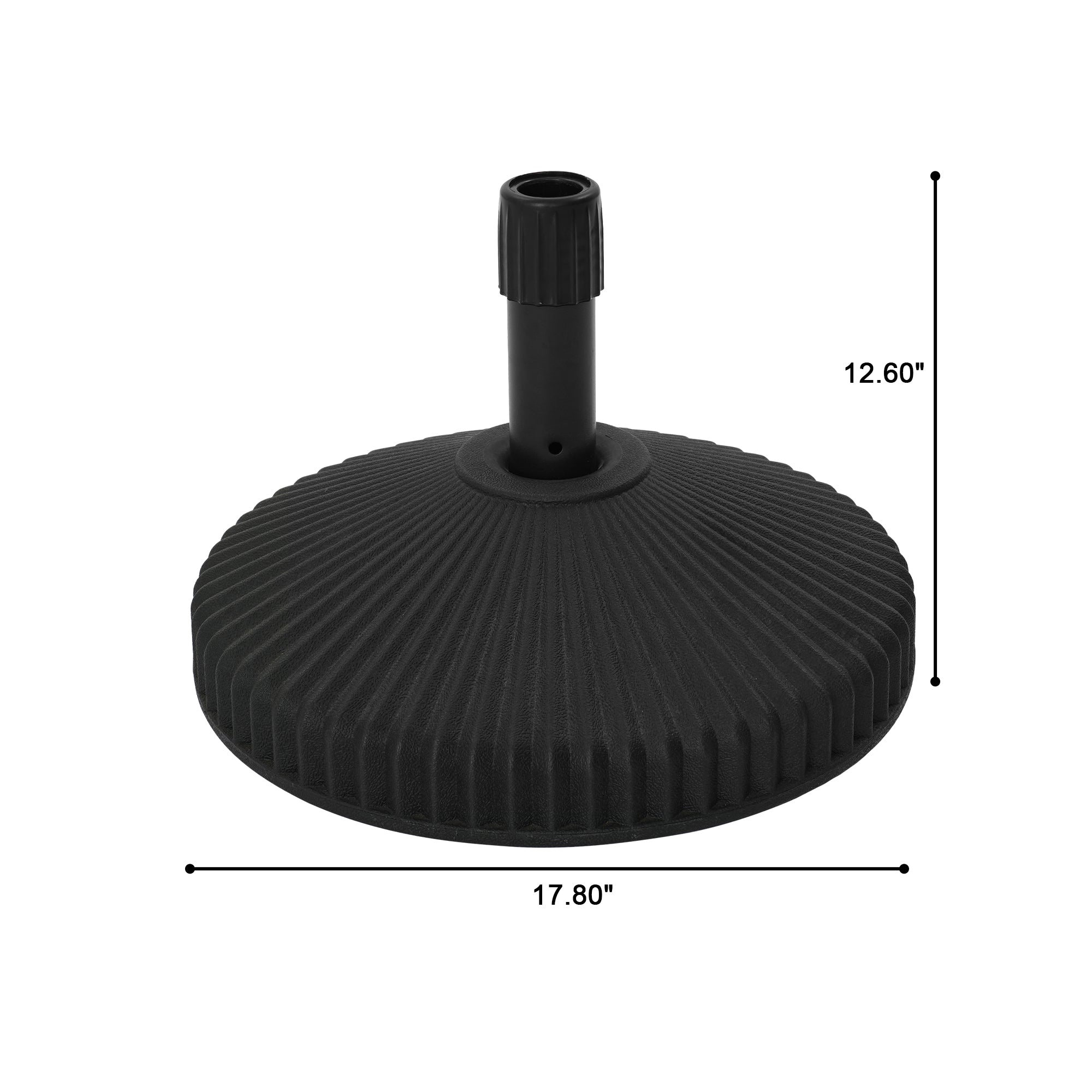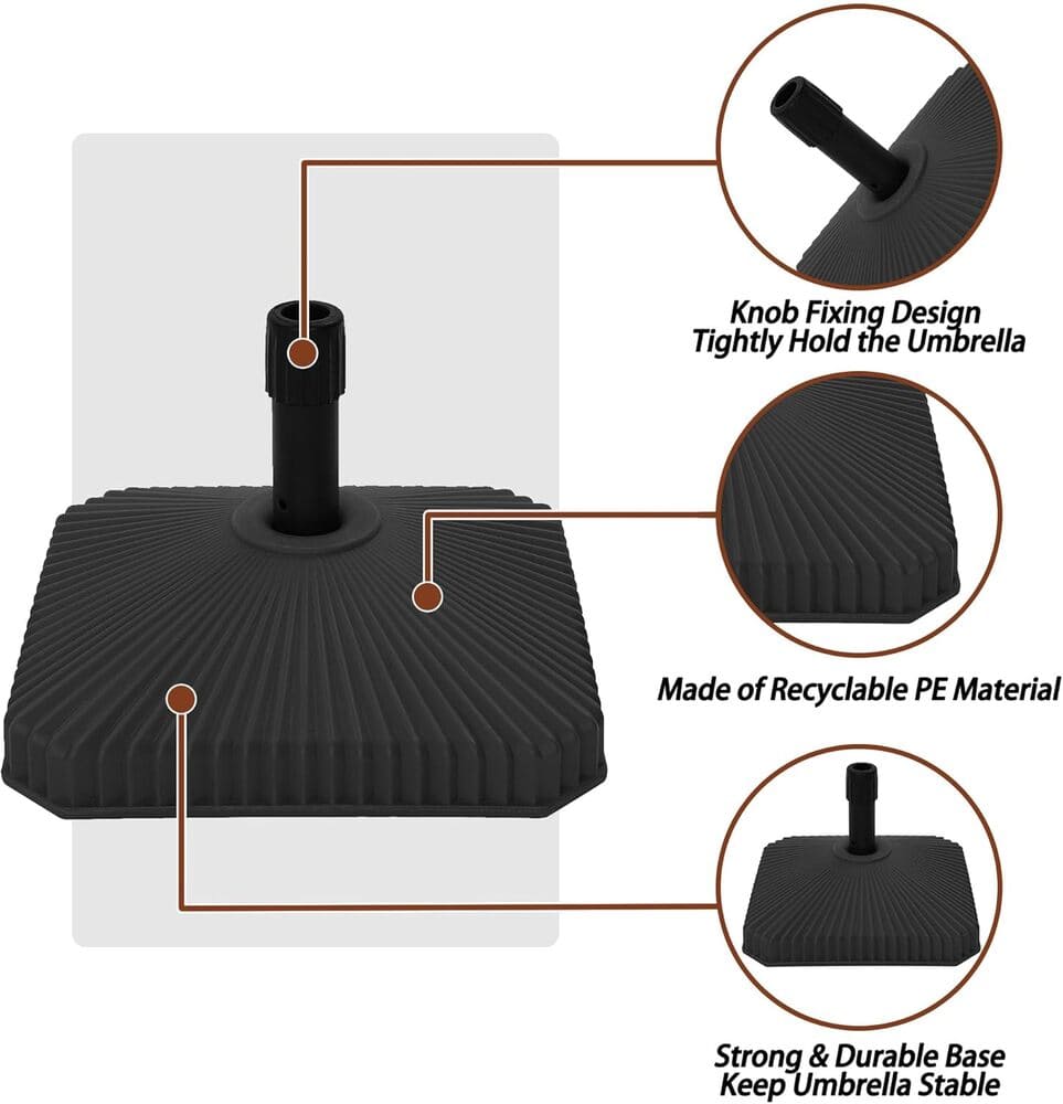 Keep your market umbrella safe with this umbrella base. Made of durable black PE material, it is truly tough and weather resistant. Water fills the umbrella base and provides 29 lbs. of weight. The unique base of this product is designed to be large enough to hold an umbrella.