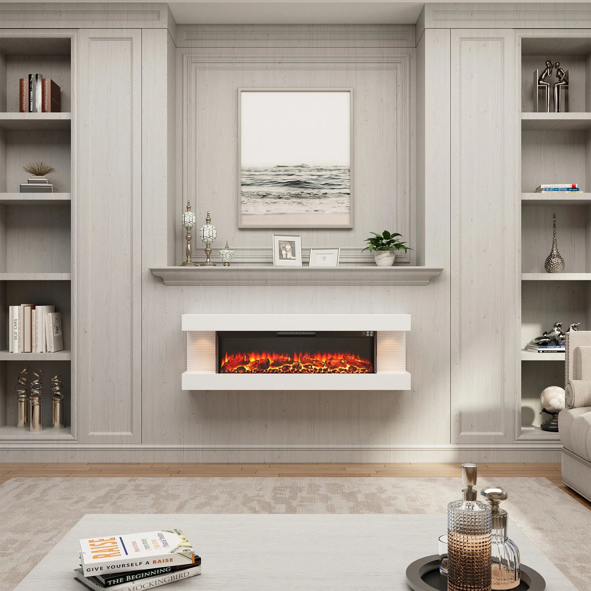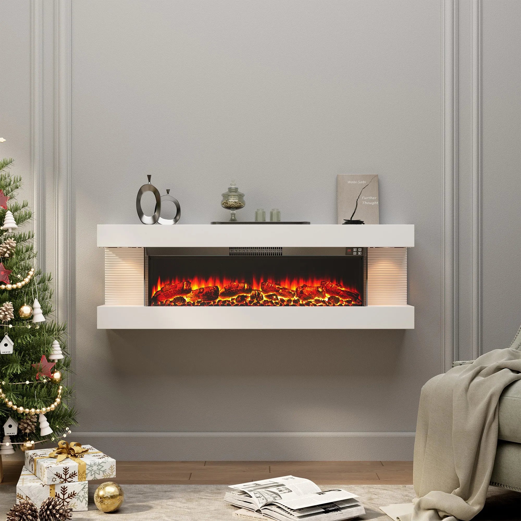 When the fashion-conscious of you find most electric fireplaces with mantels on the market dull or the brackets cumbersome to assemble, choose our all-in-one 3-sided electric fireplace. This product seamlessly integrates an electric fireplace and an electric fireplace stand, allowing you to mount it directly on the wall without the need for assembly. You can enjoy 12 realistic flame effects and the safe, cozy ambiance it creates. On either side of the lifelike resin log set, there is a space with 8-color side lamps where you can display your beloved decor. The convenient remote control enables you to elegantly control the various functions of the electric fireplace from the comfort of your bed, satisfying your pursuit of a fashionable and cozy home.