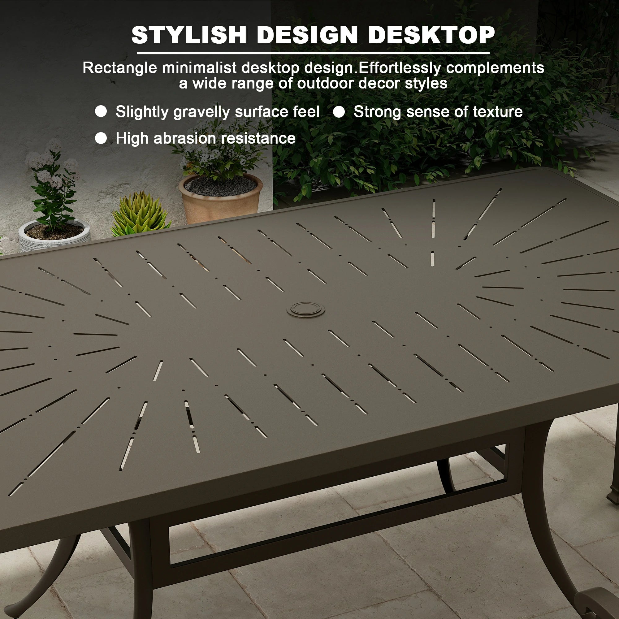 Introducing our must-have rectangular outdoor cast aluminum dining table, perfect for your outdoor living space. Its smooth, easy-to-clean tabletop features an umbrella hole for versatile use in any weather. Enhanced with non-slip pads on the legs, ensuring stability on uneven ground. Accommodating 6-8 people, it's ideal for family gatherings. Crafted with an elegant design and easy assembly, Enjoy long-lasting use and hassle-free assembly, making it the ultimate choice for your outdoor dining needs.