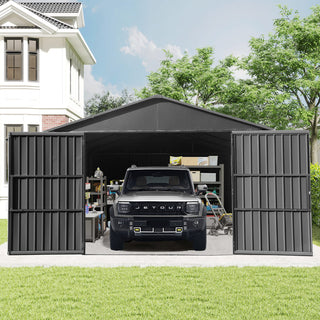 Outdoor Metal Garage Shed, Extra Large Metal Carport with Lockable Double Hinged Doors, Heavy Duty Car Shelter for Car, Truck, Motorcycle and Lawn Equipment, Grey